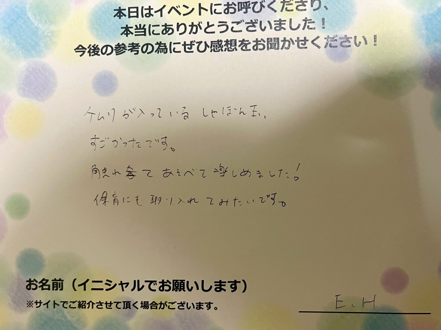 お客様の声ケムリが入っているしゃぼん玉、すごかったです。