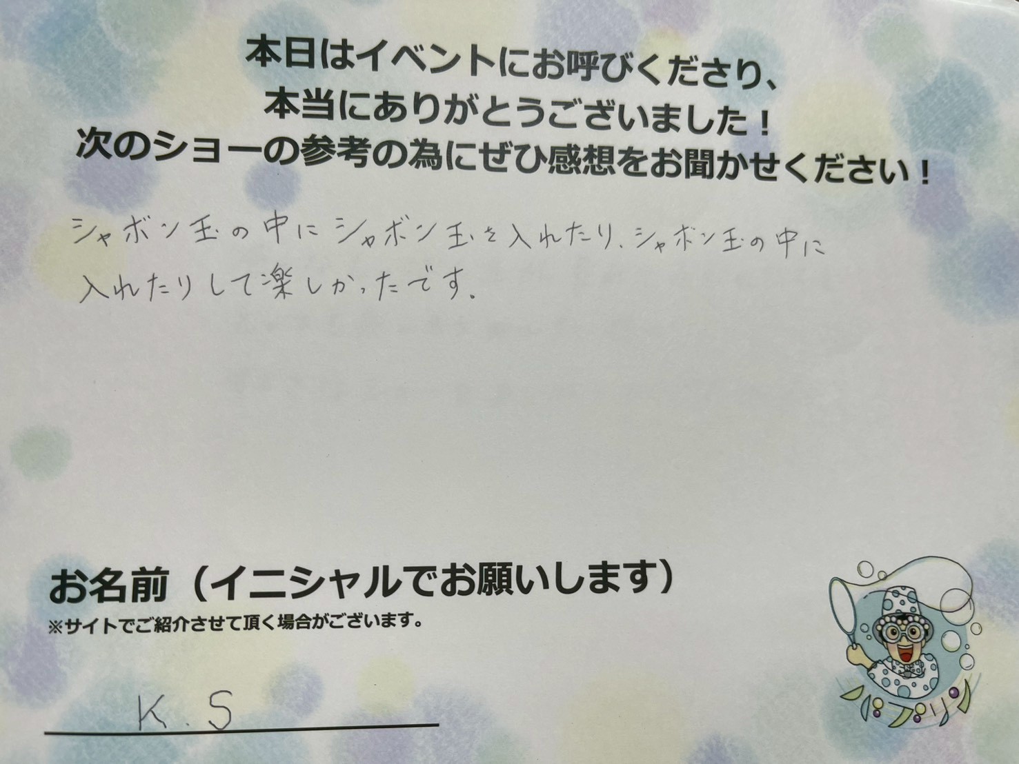 「バブリン先生のシャボン玉ショー」のご依頼・ご相談は、