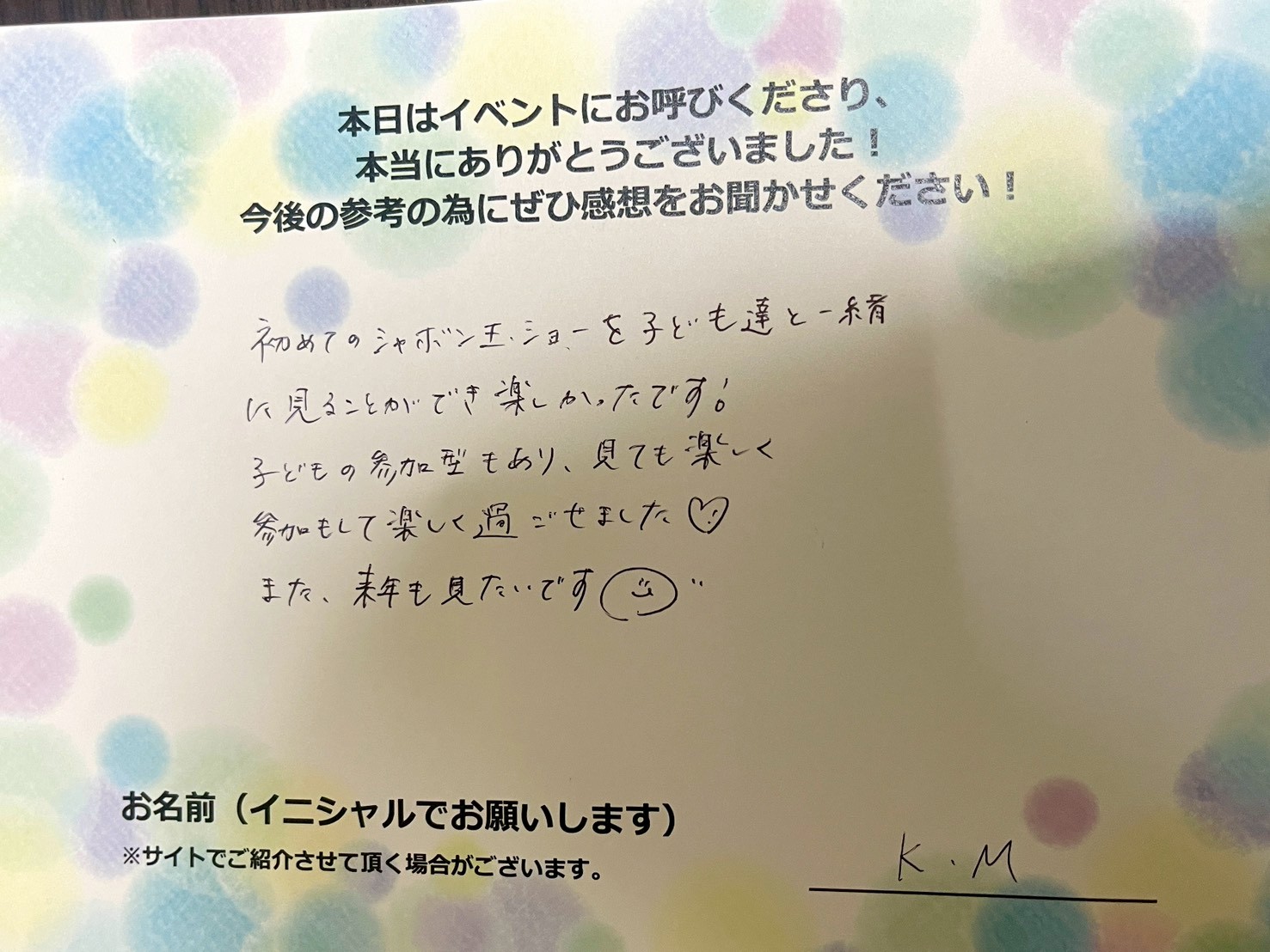 お客様の声初めてのシャボン玉ショーを子ども達と一緒