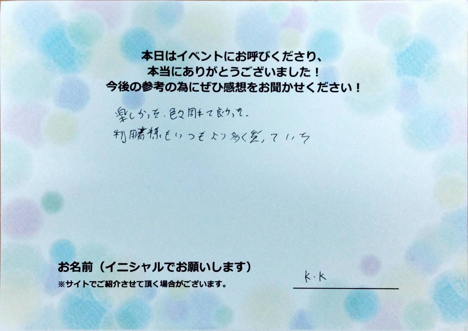 お客様の声楽しかった。色々周れてよかった。