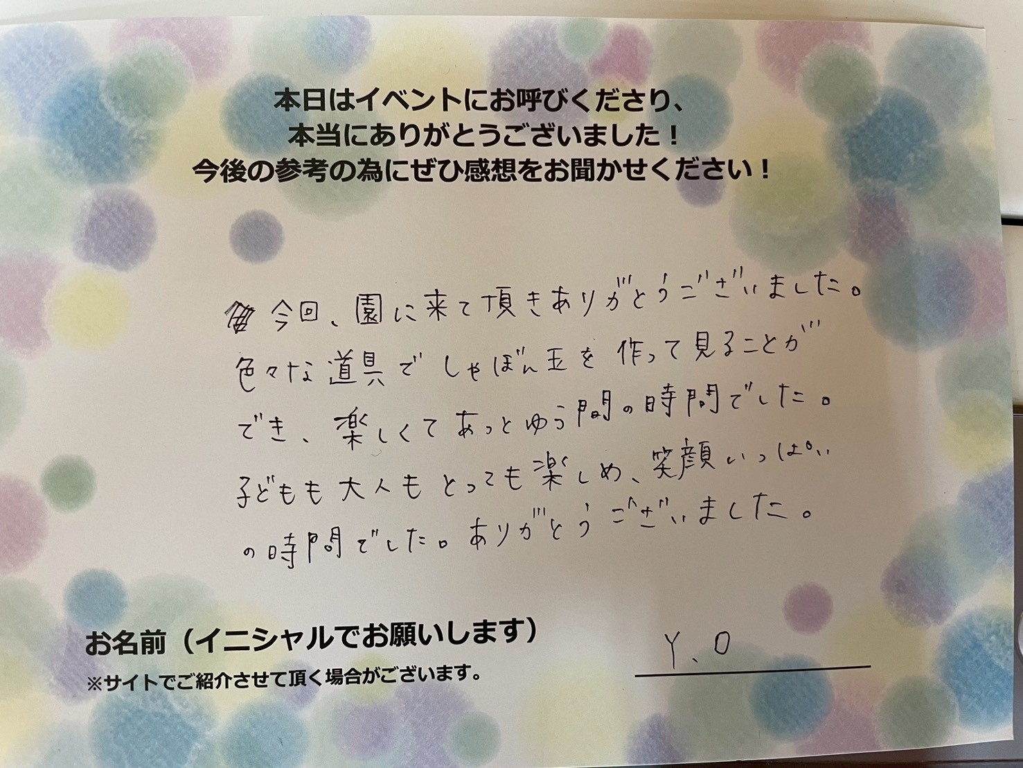 色々な道具でしゃぼん玉を作って見ることが” でき、楽しくてあっとゆう間の時間でした。