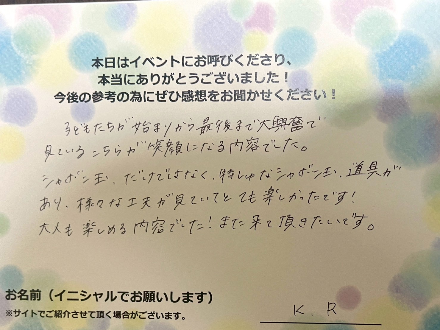 「バブリン先生のシャボン玉ショー」のご依頼・ご相談は、