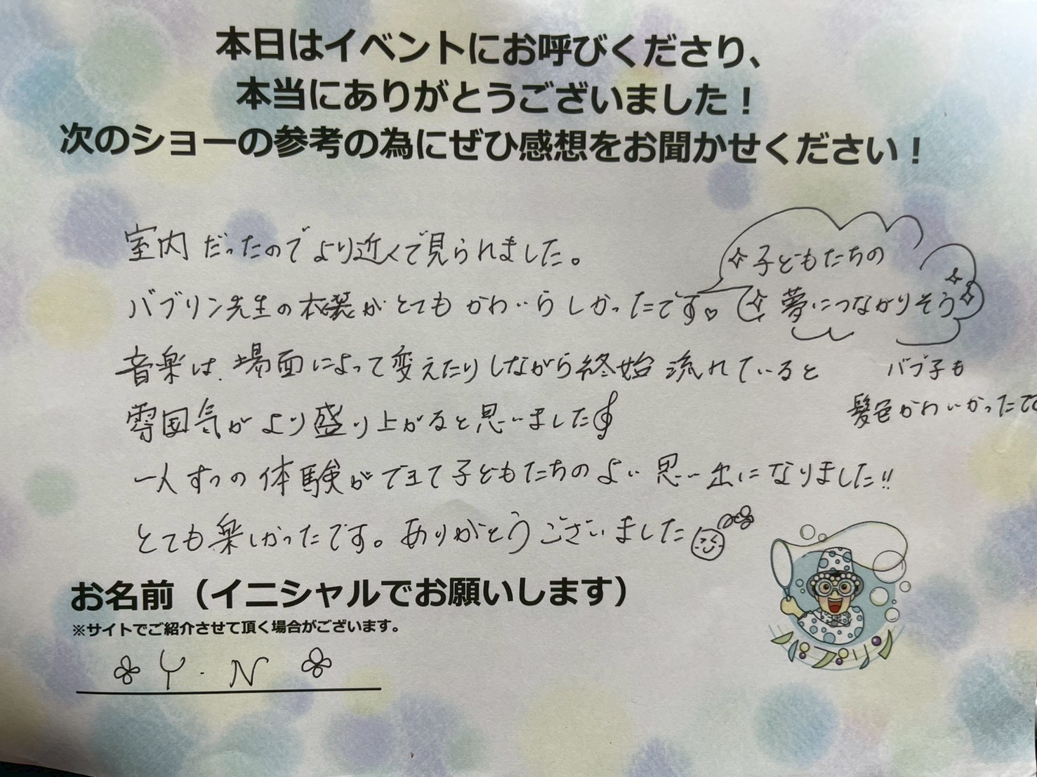 「バブリン先生のシャボン玉ショー」のご依頼・ご相談は、