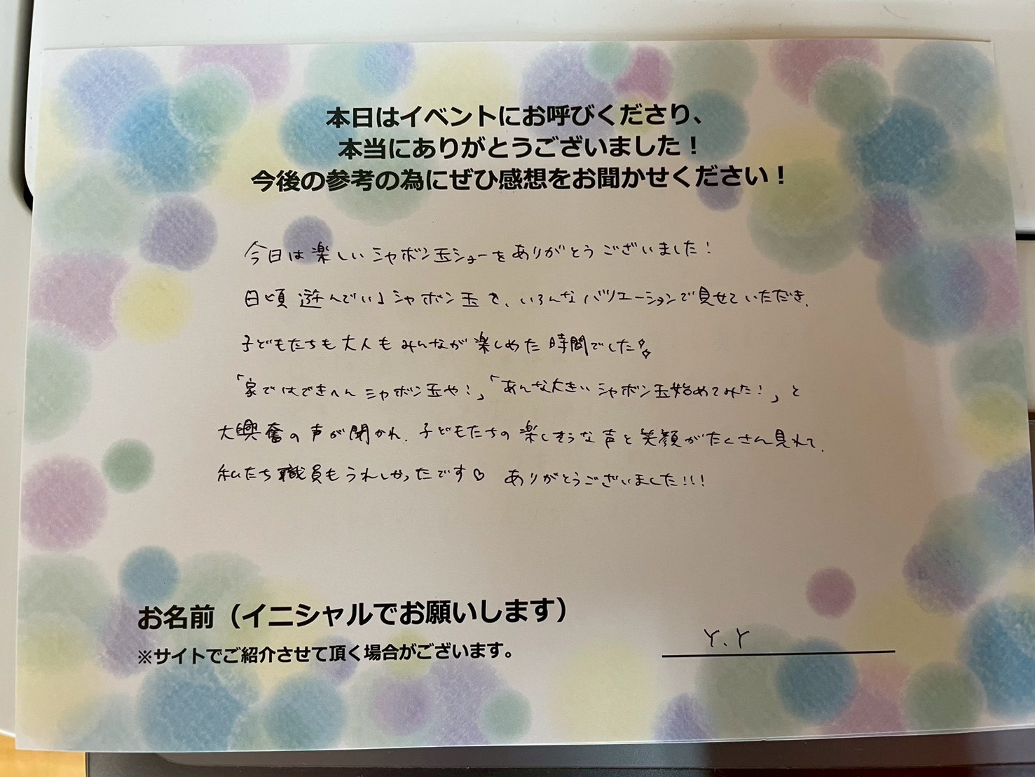 お客様の声今日は楽しいシャボジ玉ショーをありがとうございました!