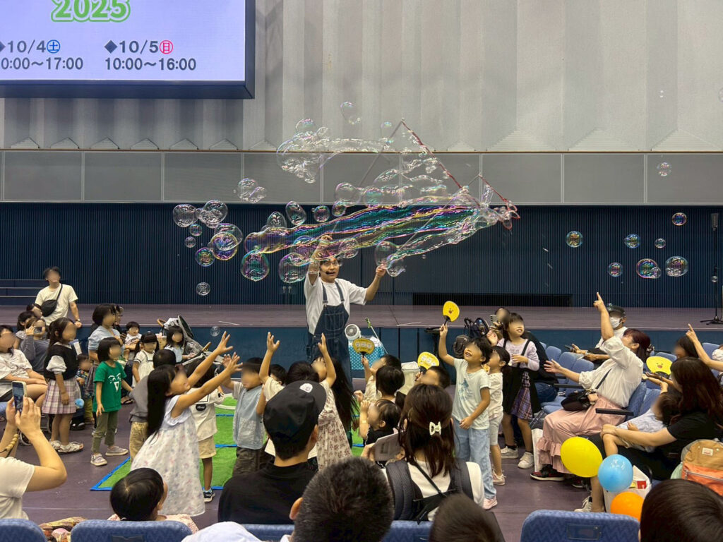 会場いっぱいに広がる色とりどりのシャボン玉に、子どもたちの歓声が響き渡りました。