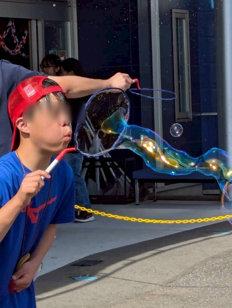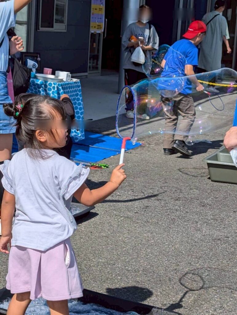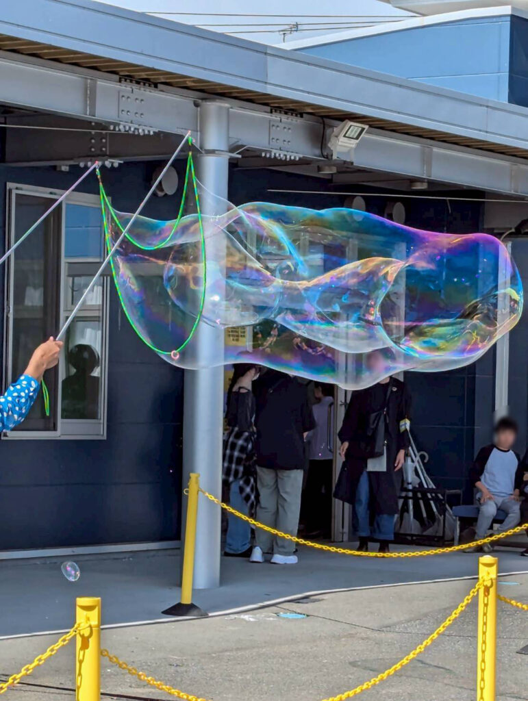 屋外シャボン玉ショーだったので、巨大シャボン玉や紐でのたくさんのシャボン玉に皆さん拍手してくれました。